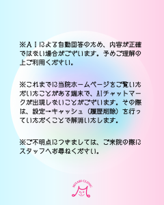 ※これまでに当院ホームページをご覧いただいたことがある端末で、AIチャットマークが出現しないことがございます。この際は、設定→キャッシュ(履歴削除)を行なっていただくことで解消いたします。