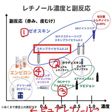 私は、強いレチノールは赤ら顔が酷くなっちゃうので、どちらかというと、濃度が低いレチノール、あるいはパルミチン酸レチノールや、リノール酸レチノールで、負担をかけずにコツコツビタミンAをためていくやり方が、個人的には好みの方法です![]()