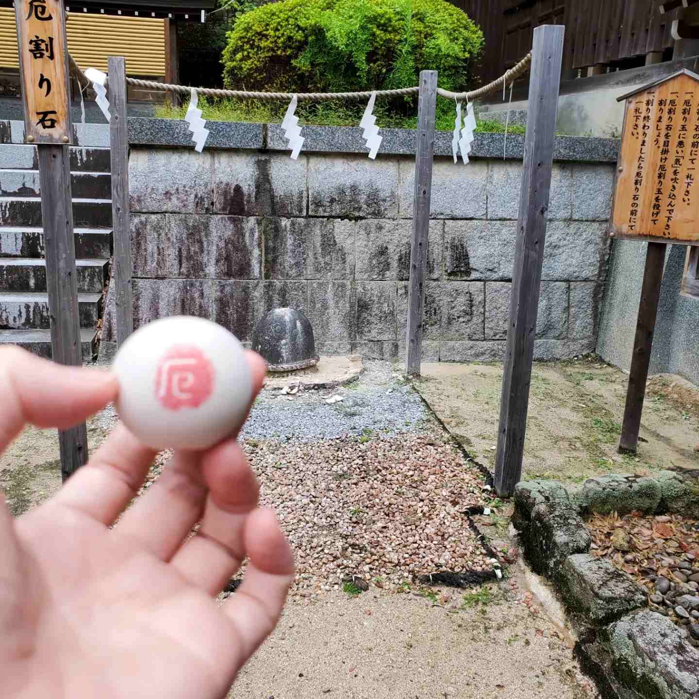 厄玉の中に息を吹きかけて、厄割石をめがけて割るのです!