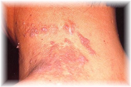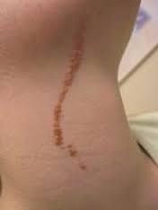 あざはは硬い淡紅色で、線状に配列し強い掻痒感を伴います。