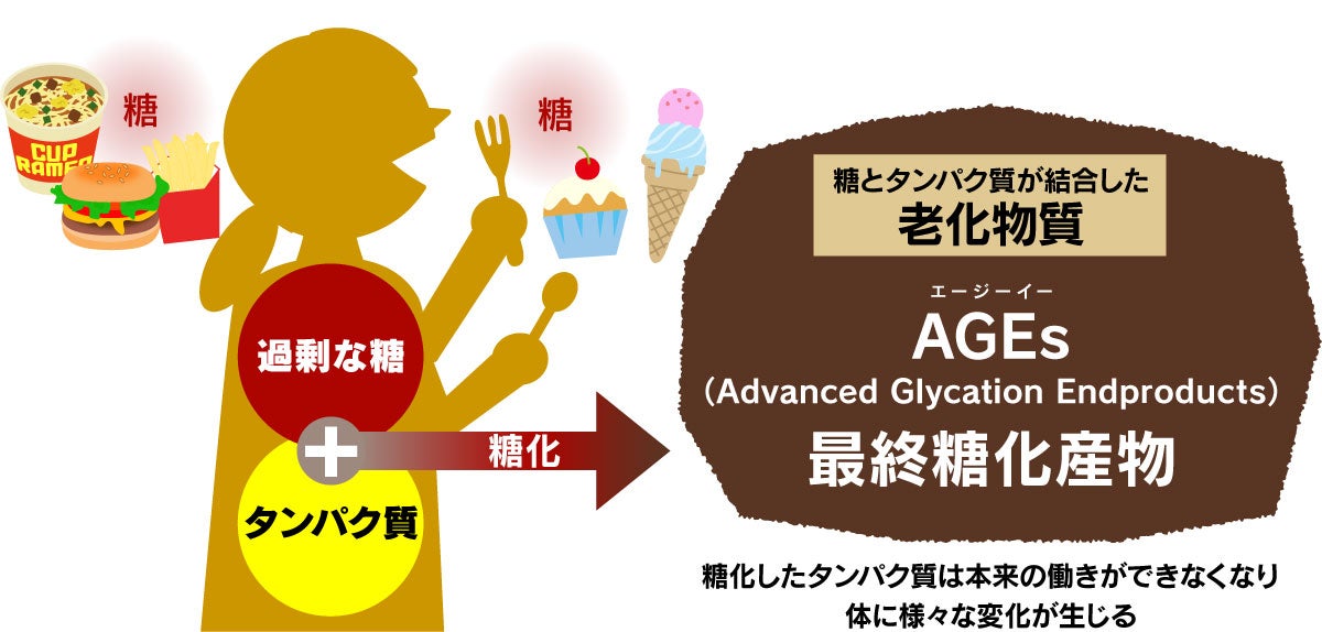 ①体内のタンパク質と血中の糖が結びついてAGEが産生される